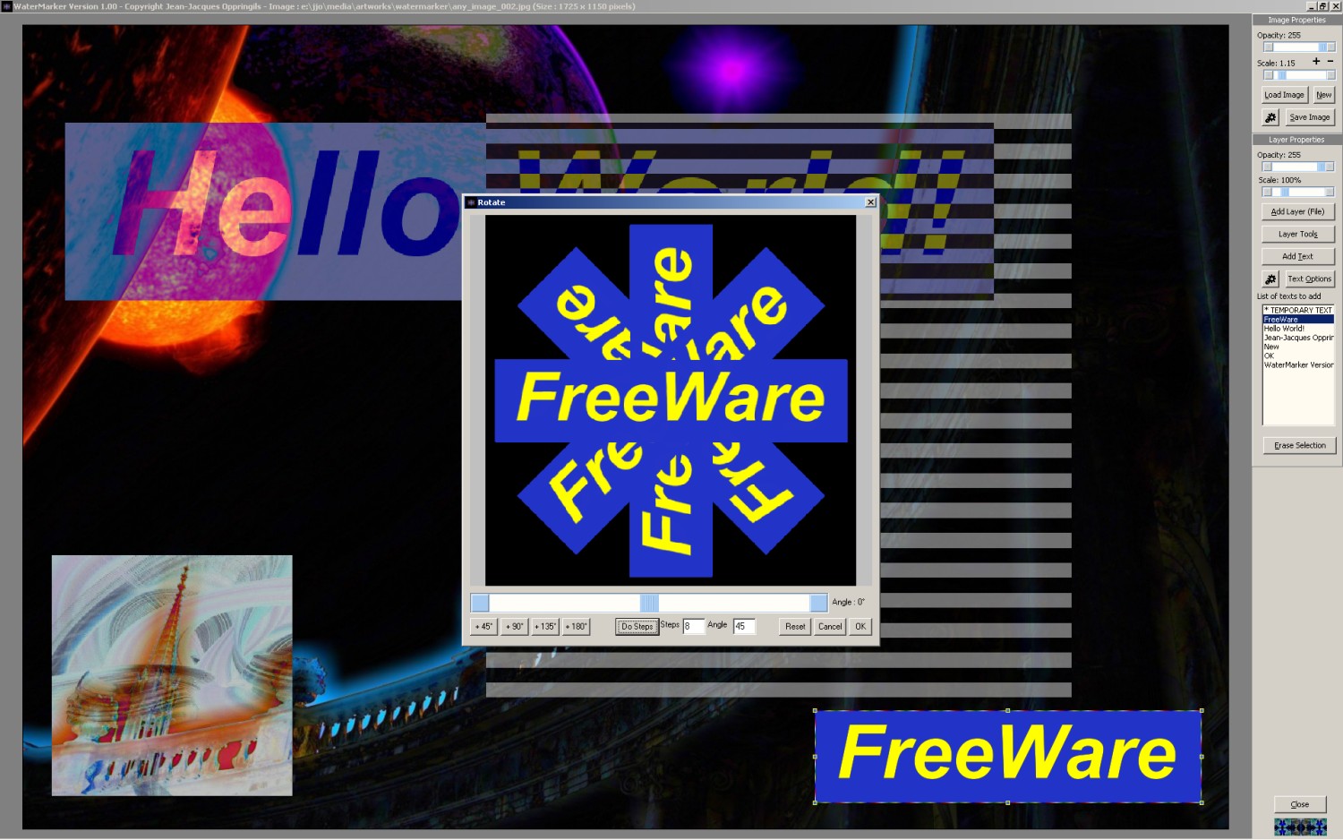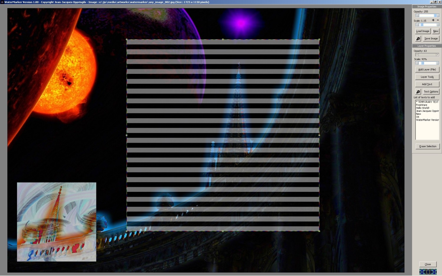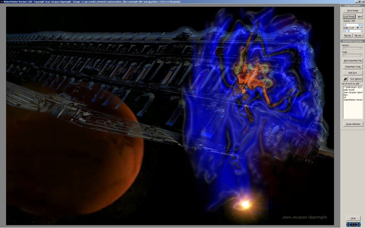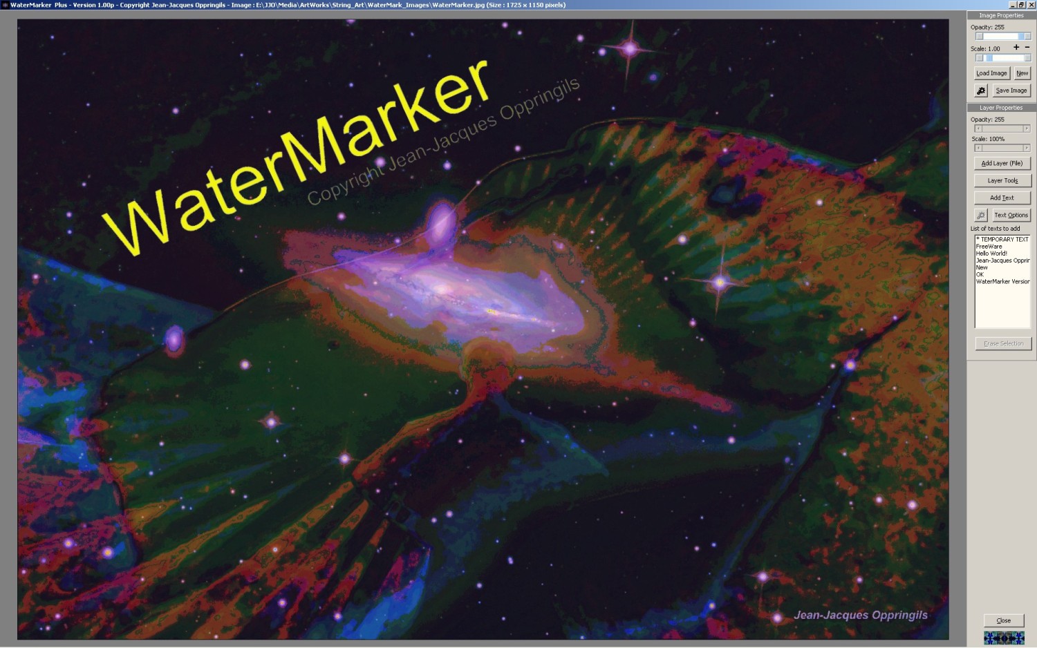 If you want more options, you can upgrade to the WaterMarker Plus version WaterMarker Plus example of use : How to create the following artwork with this program ?