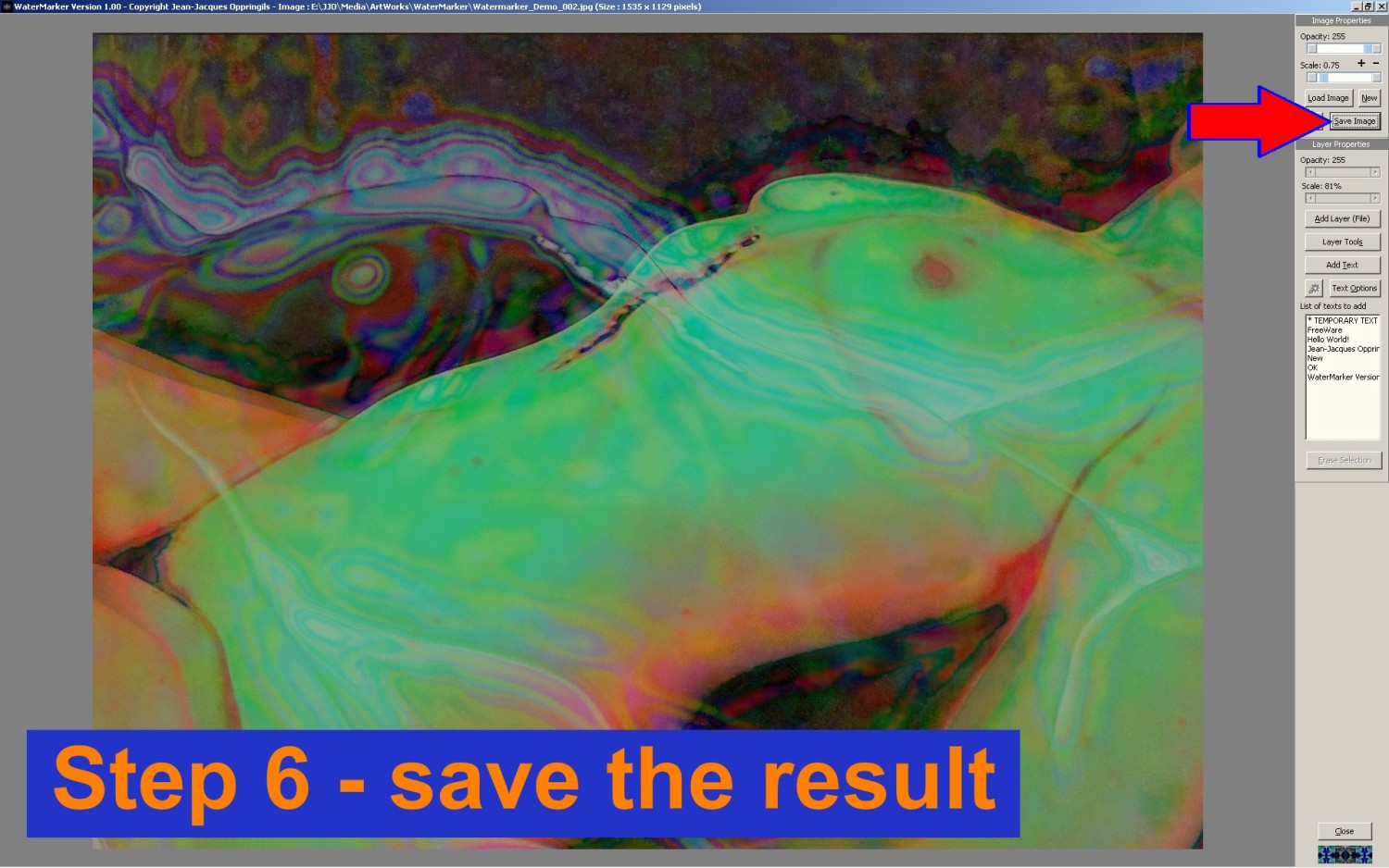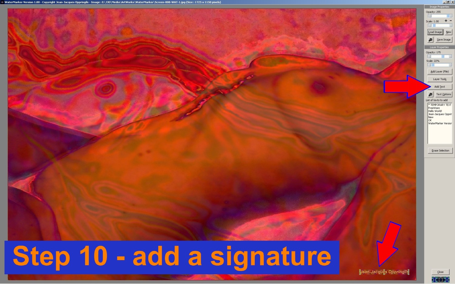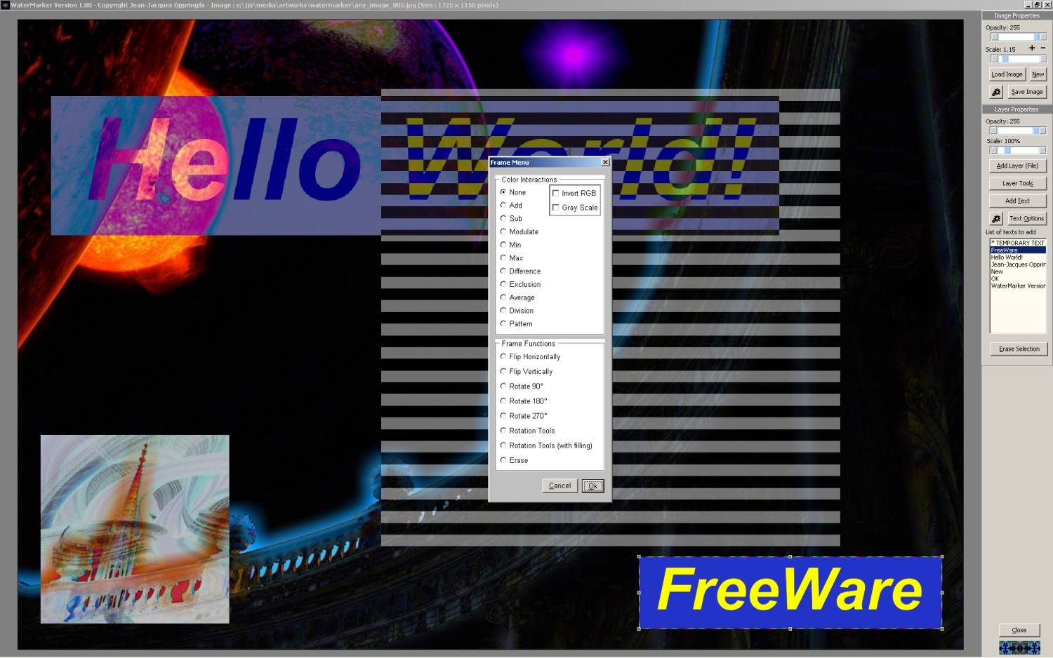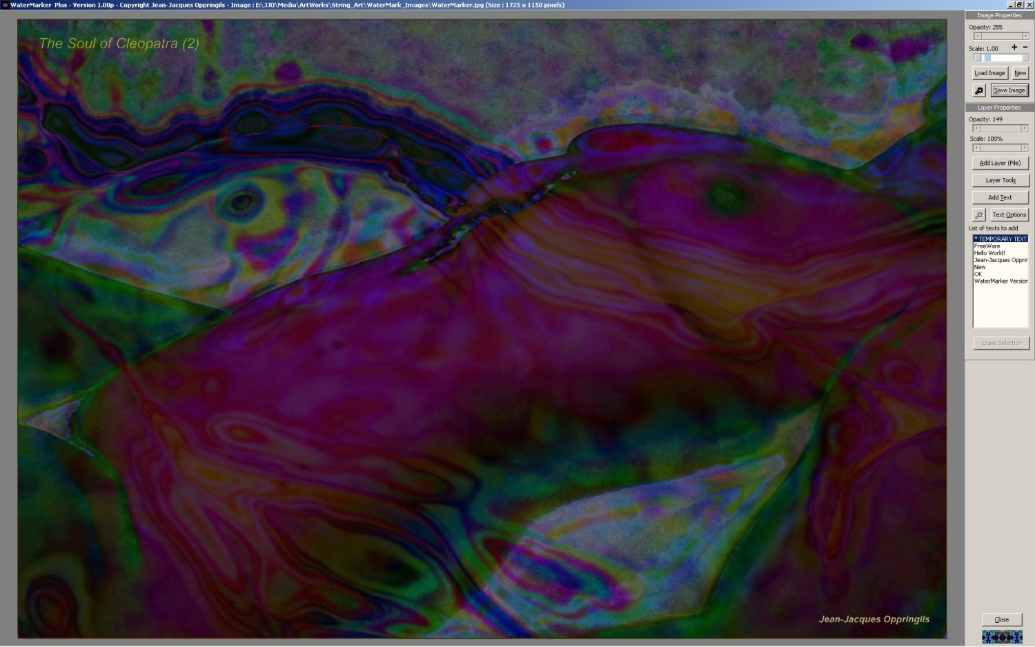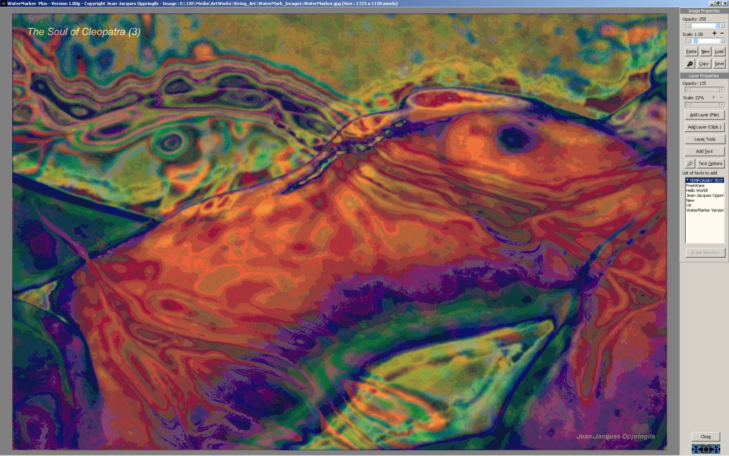 If you want more options, you can upgrade to the WaterMarker Plus version WaterMarker Plus example of use : How to create the following artwork with this program ?
