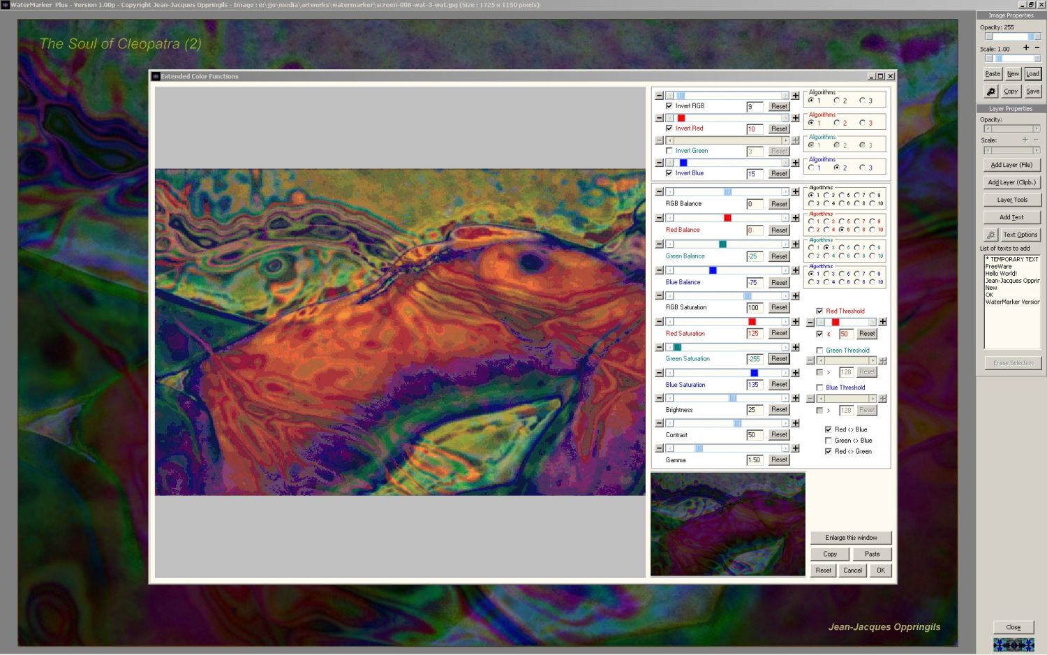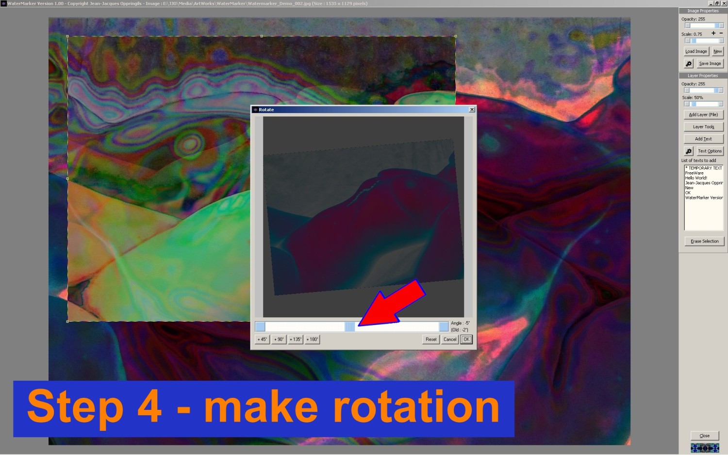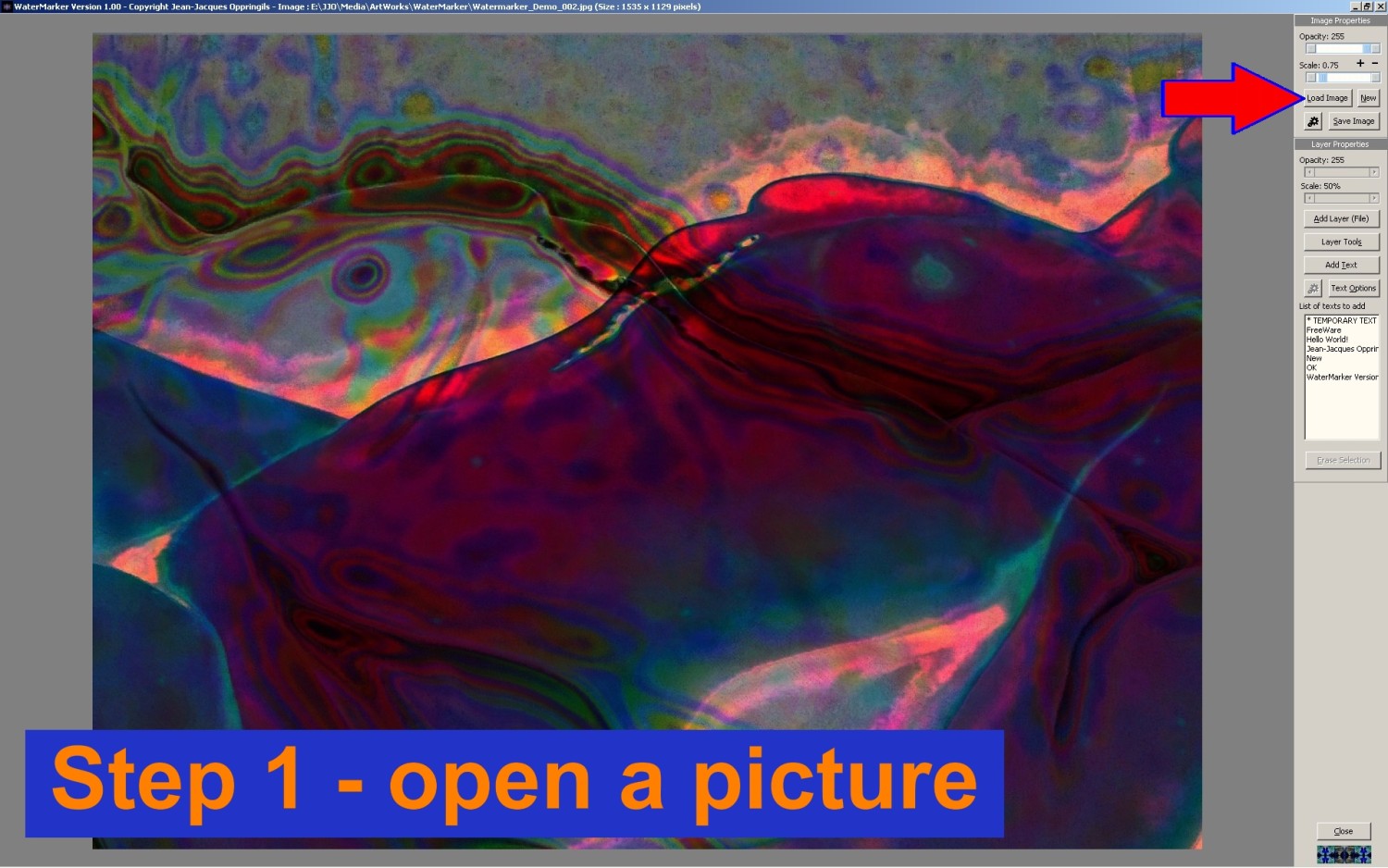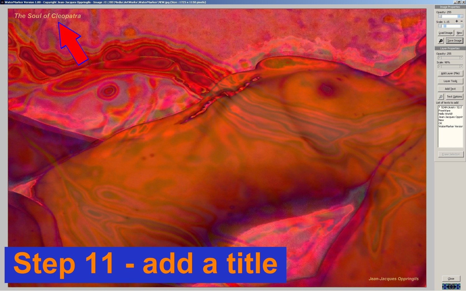 If you want more options, you can upgrade to the WaterMarker Plus version WaterMarker Plus example of use : How to create the following artwork with this program ?